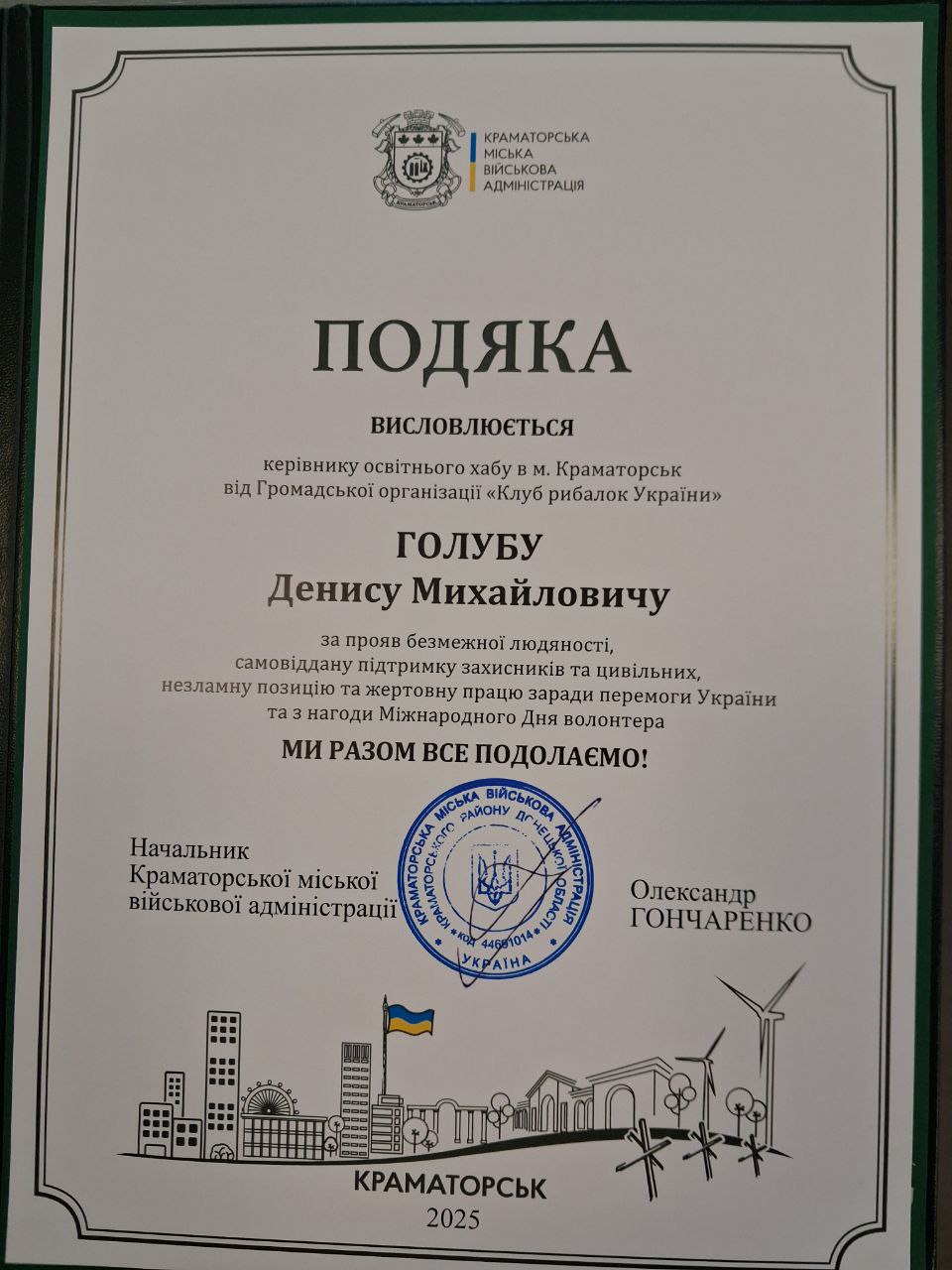 Викладач Академії відзначений Подякою Краматорської МВА за волонтерську діяльність