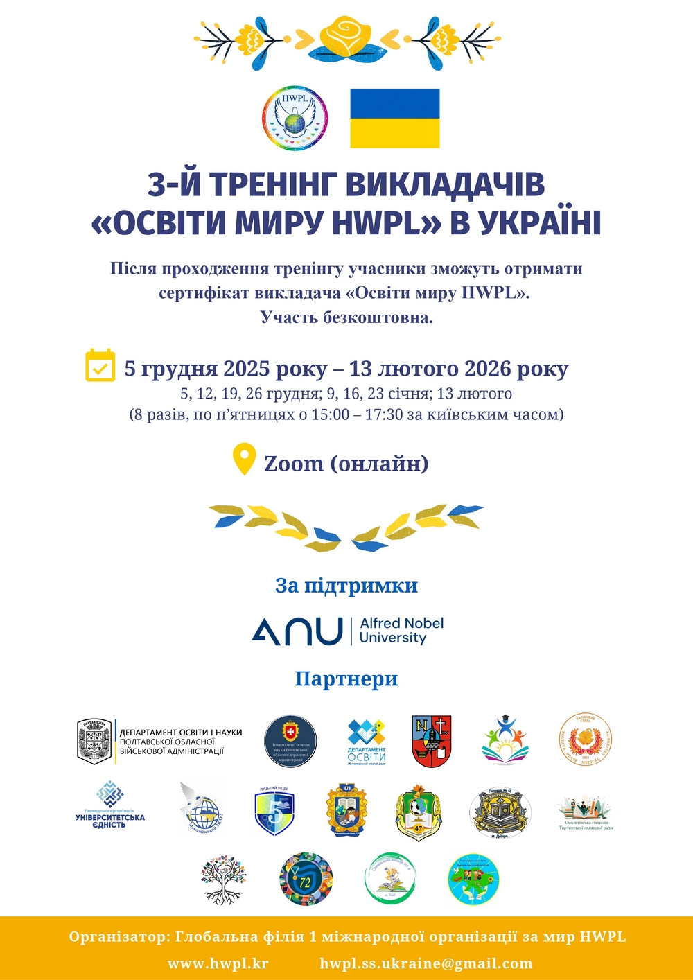 Освітян ДДМА запрошують узяти участь онлайн у 3-му Тренінгу викладачів «Освіти миру HWPL&r...