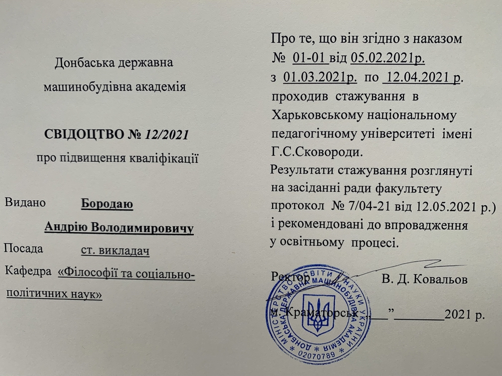 Науковий ступінь, посада: канд. іст. наук, доцент.