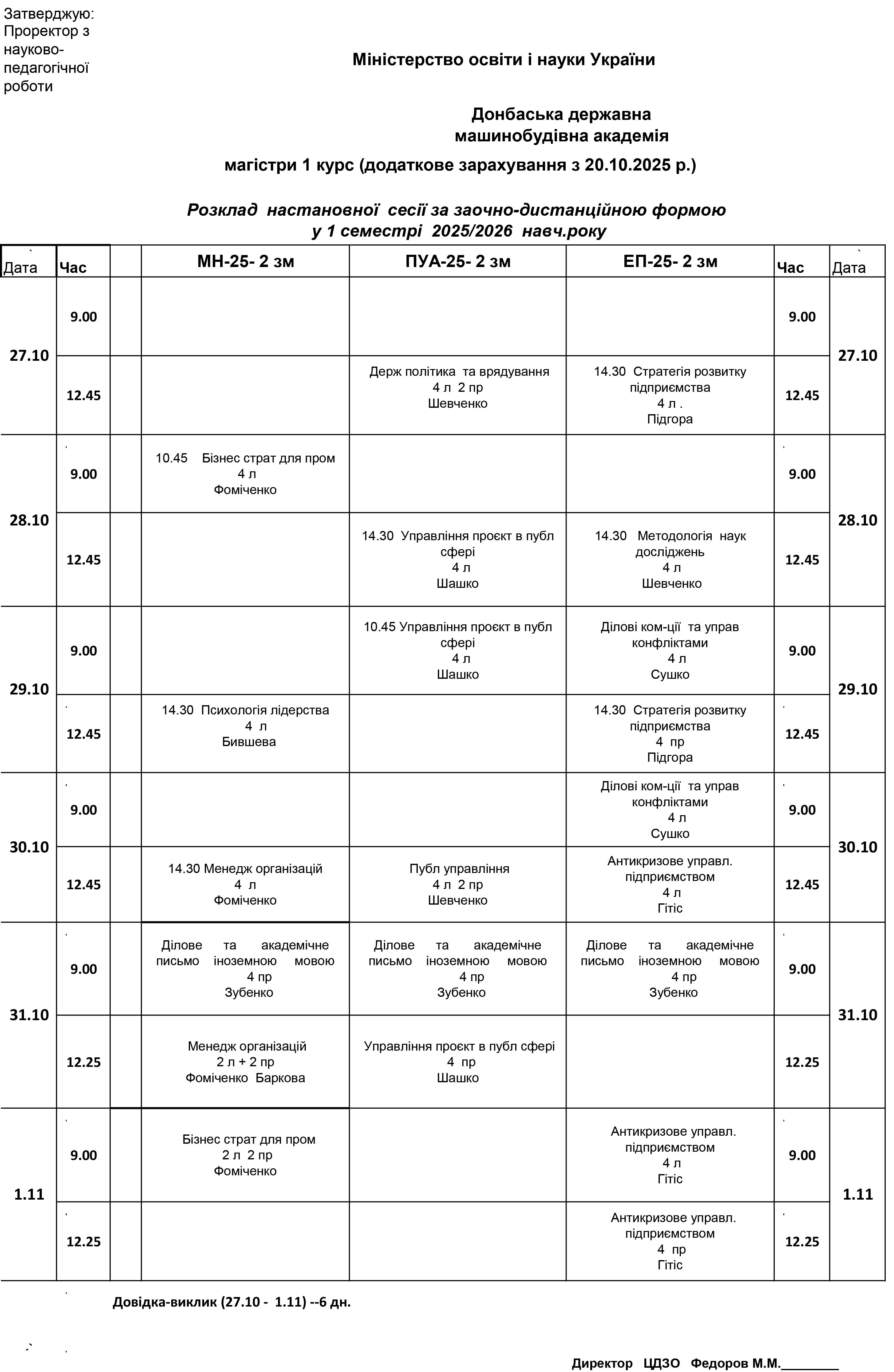 Розклад настановної сесії 1-го семестру для магістрів 1-го курсу (додаткове зарахування з 20.10.2025 р.)