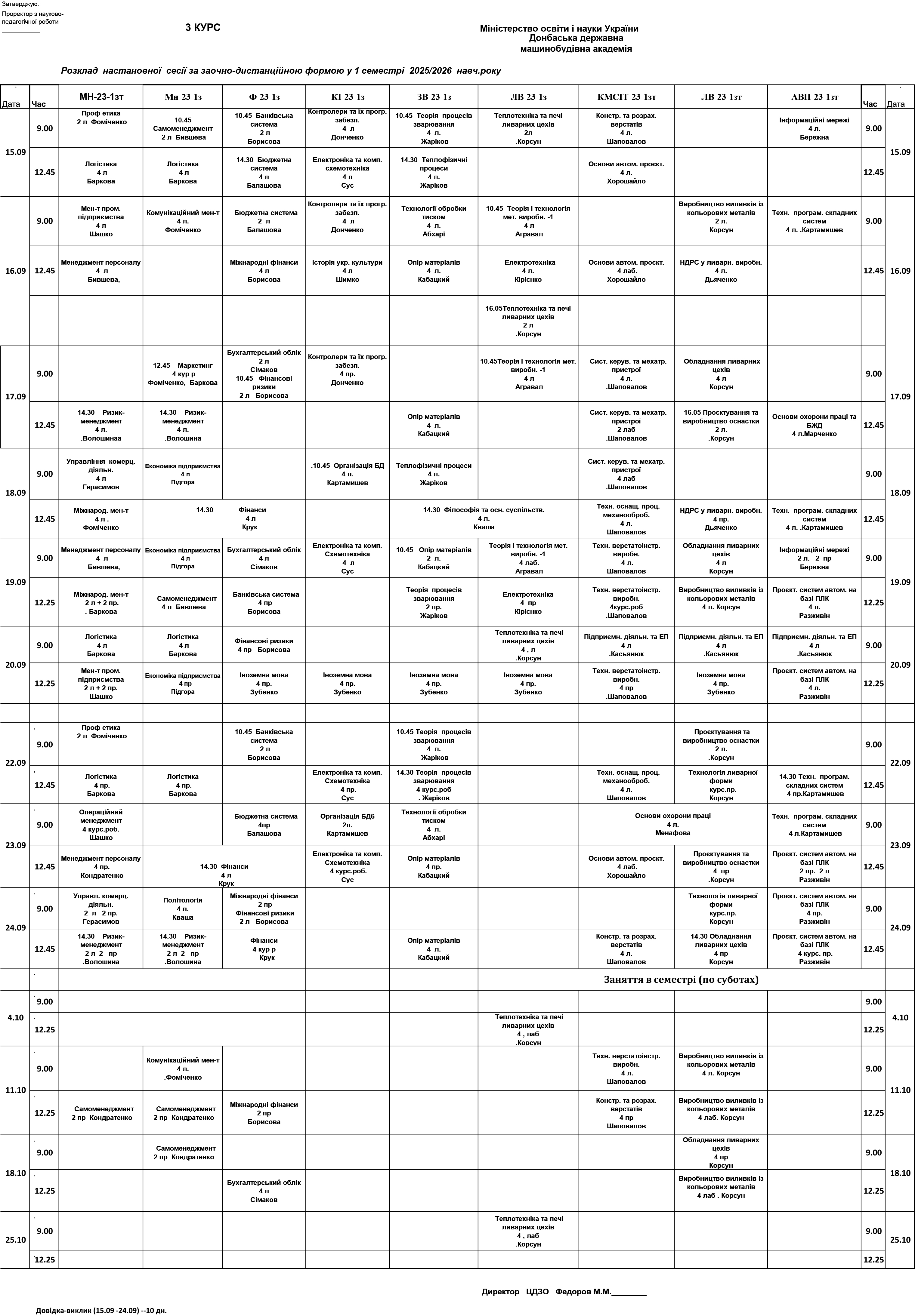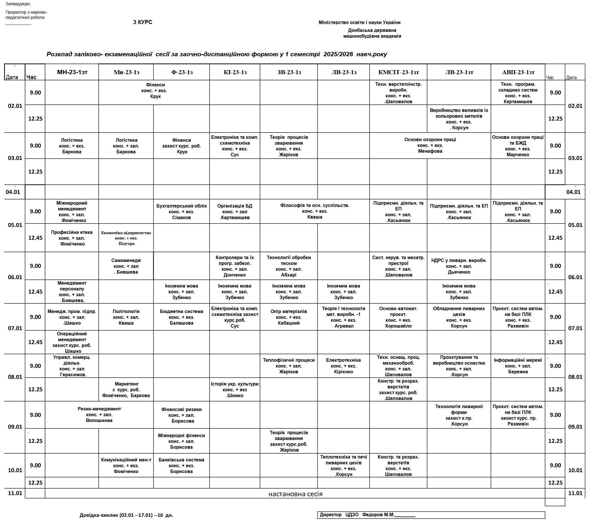 Розклад осінньої заліково-екзаменаційної сесії 2025-2026 навч. року за заочно-дистанційною формою
