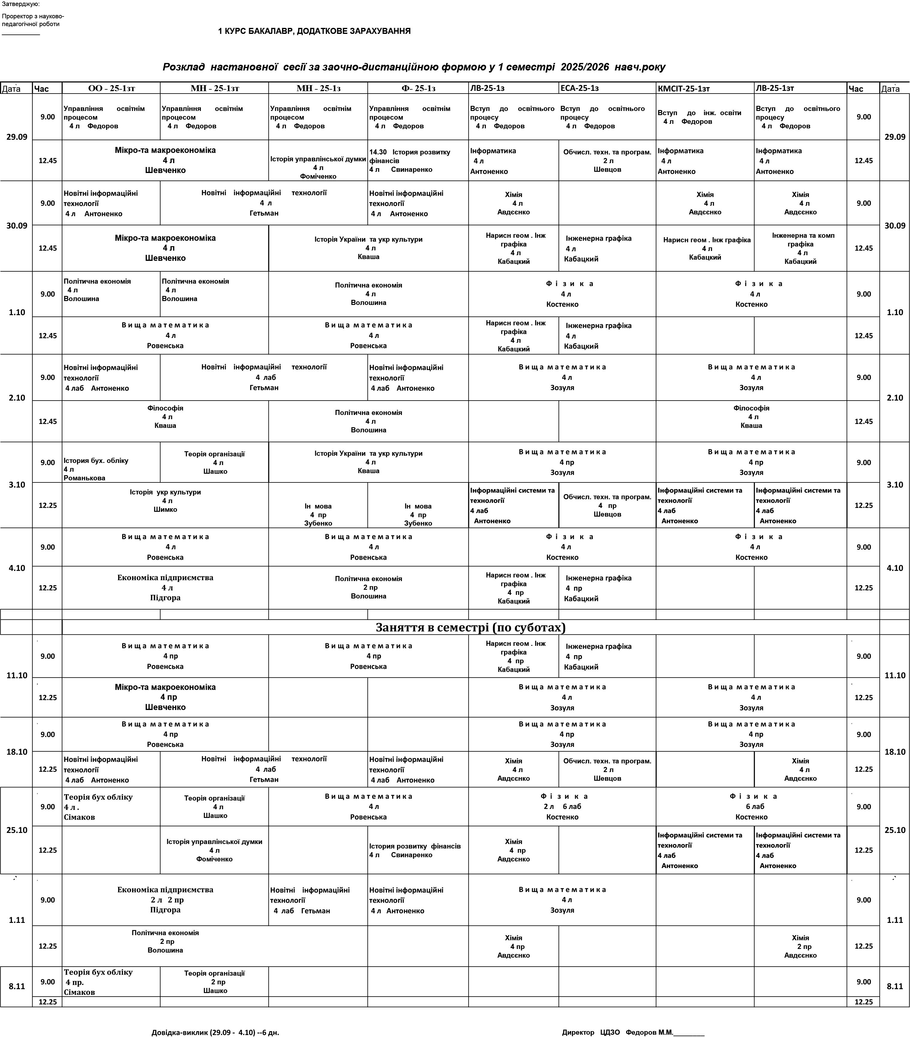 Розклад настановної сесії за заочно-дистанційною формою у 1 семестрі 2025/2026 навч. року.