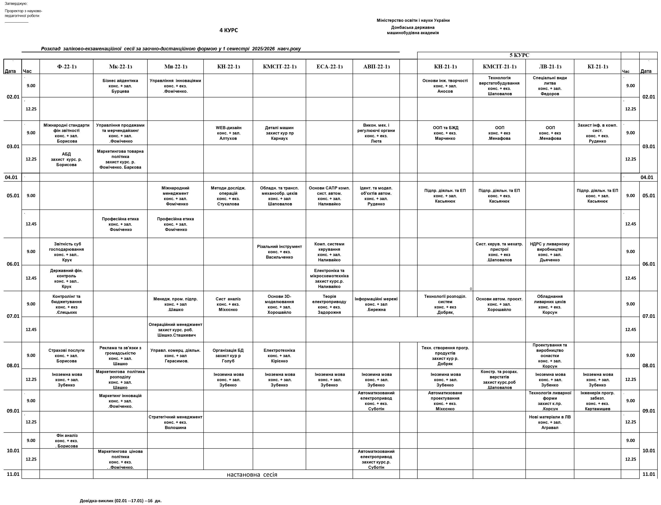 Розклад заліково-екзаменаційної сесії за заочно-дистанційною формою у 1 семестрі 2025/2026 навч. року.